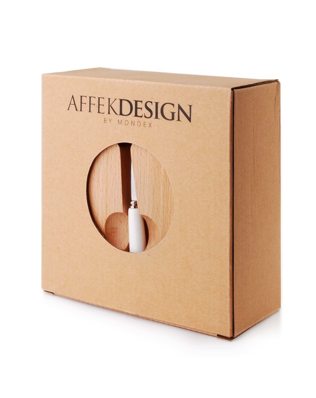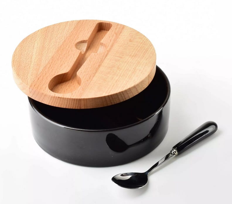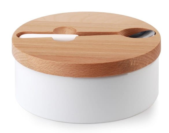 Cukiernica porcelanowa w prostym, nowoczesnym kształcie w połączeniu z bambusową pokrywką, w której umieszczona jest łyżeczka do cukru.