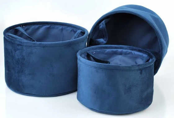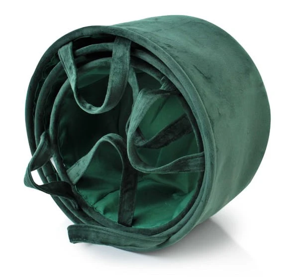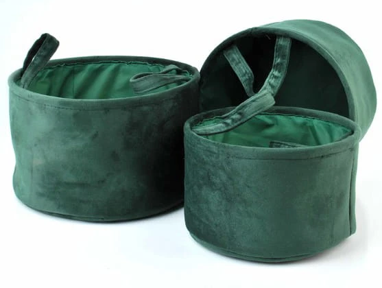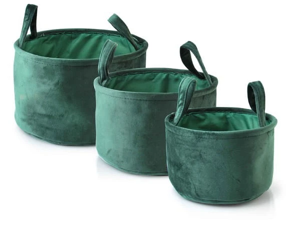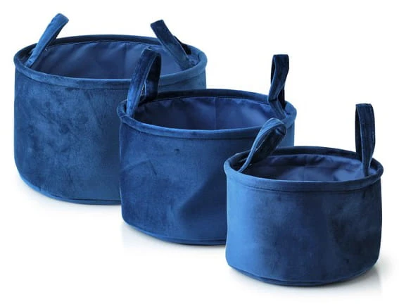 Zestaw 3 materiałowych koszy dekoracyjnych do przechowywania w różnych rozmiarach. Wykonane z ekskluzywnego materiału typu Welur. Kosze posiadają rączki w postaci przyszytego materiału.