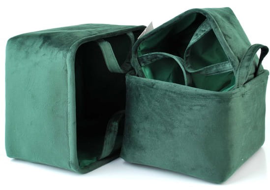 Zestaw 3 materiałowych koszy dekoracyjnych do przechowywania w różnych rozmiarach. Wykonane z ekskluzywnego materiału typu Welur. Kosze posiadają rączki w postaci przyszytego materiału.