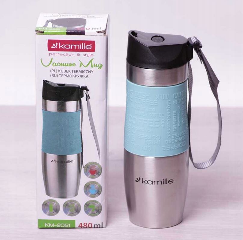 - Kubek - termos firmy KAMILLE wykonany ze stali nierdzewnej z automatycznym systemem otwierania.