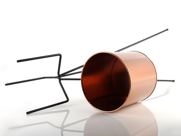 Metalowa osłonka w kolorze złota na trójnogu w kolorze czarnym.