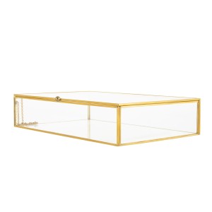 Szklana szkatułka idealnie sprawdzi się jako ozdoba w każdym domu. Naczynie wykonane z wysokiej jakości szkła posiada złote elementy. Wspaniale prezentować się będzie w niej biżuteria, kosmetyki czy ulubione drobiazgi. Dzięki połączeniu złotych rantów i szkła, szkatułka będzie pasowała zarówno do minimalistycznych, jak i tradycyjnych aranżacji wnętrz.