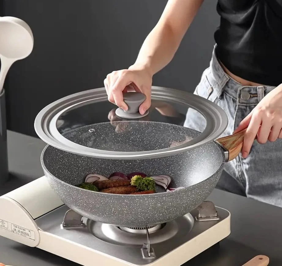- Pokrywka wykonana jest z wysokiej jakości szkła hartowanego i z silikonu przeznaczonego do kontaktu z żywnością. Bezpieczniejsze, mocniejsze niż zwykłe szkło i brak rdzy metalu. Silikonowy pierścień zewnętrzny i przycisk antypoślizgowy są odporne na temperaturę do 230°C.